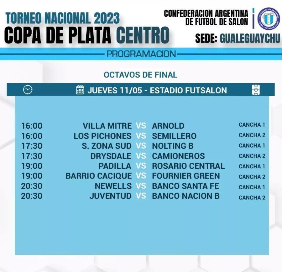 Luego de jugarse la quinta fecha de la fase de grupos, se dieron a conocer los equipos que representan a la metro y que ya tienen el boleto a octavos de final. Los partidos se disputarán a partir de hoy a las 16:00 horas en el estadio Futsalon. Ellos son Drysdale, Padilla, Nolting B, Villa Mitre y Banco Nación B. El único que no clasificó fue Florida Club a quien no le alcanzó, tras perder su último partido con Los Pichones de Mar del Plata.